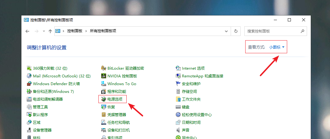 打开电脑控制面板,把查看方式改为【小图标】,找到电源选项。