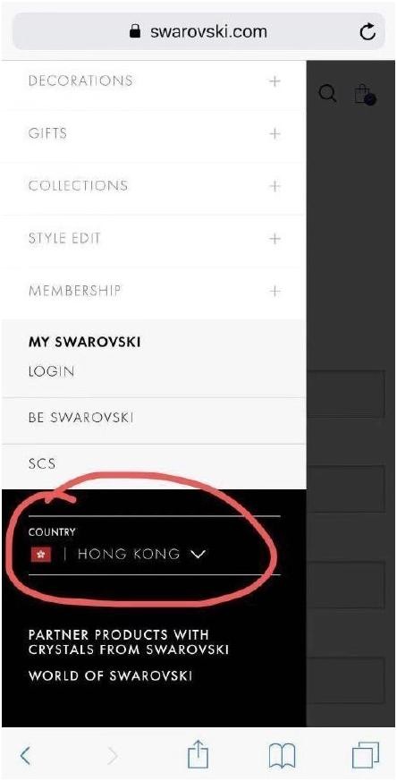 日前,有网友发现施华洛世奇官网将香港列为“country(国家)”。