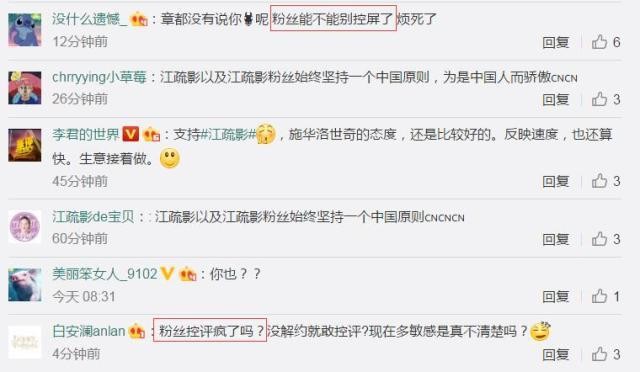 对此,有网友评论称,“别人都在解约,就她在买粉丝控评”;“粉丝能不能别控评了”;“粉丝控评疯了吗?”