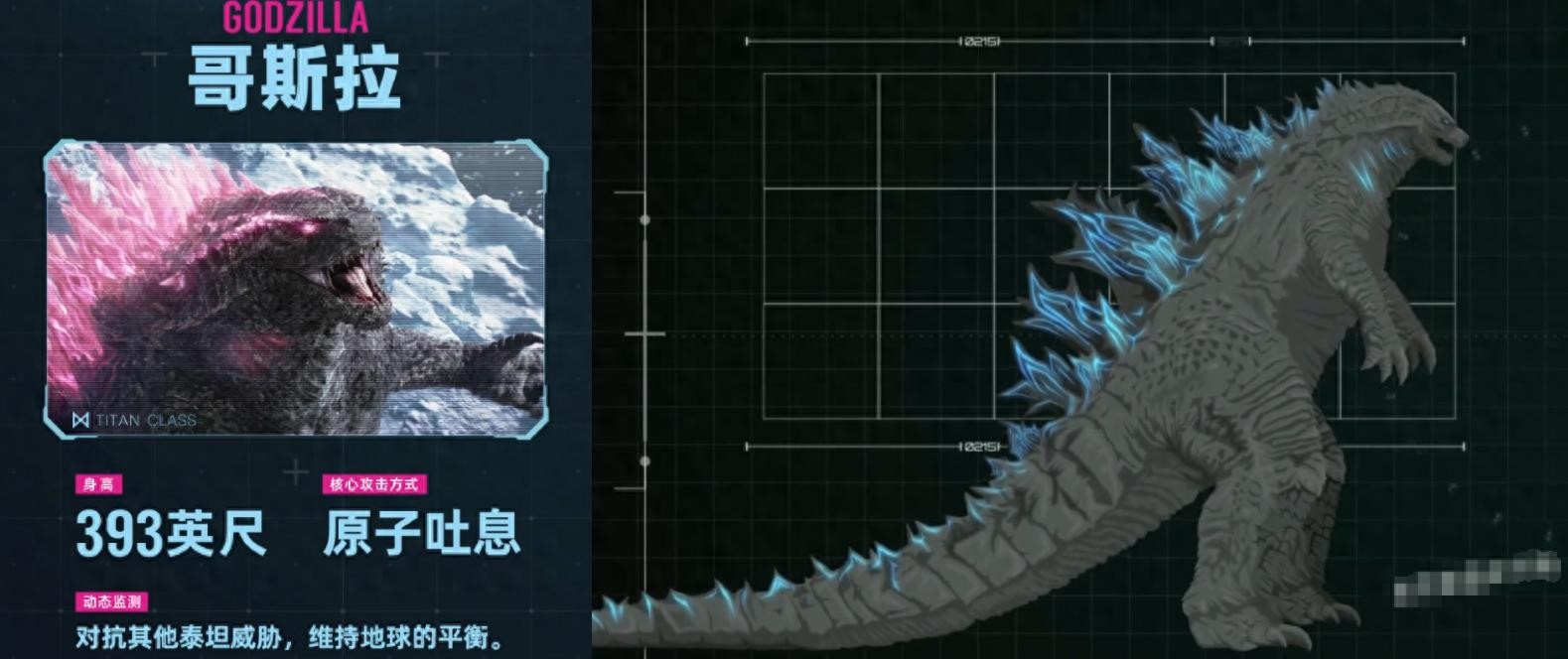 首先就是哥斯拉,外号哥总怪兽,宇宙一哥,世界平衡的守护者,身高120米,技能原子吐息、尾部扫荡、背极尖刺额外加成,极地粉色能量。