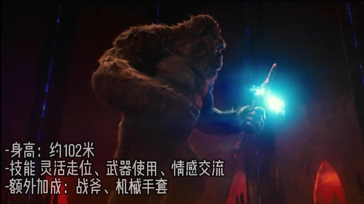 金刚,外号靓仔,生命守护者,身高约102米,在前一部电影里身高还是82米,灵活走位武器使用战斧,机械手套加成。