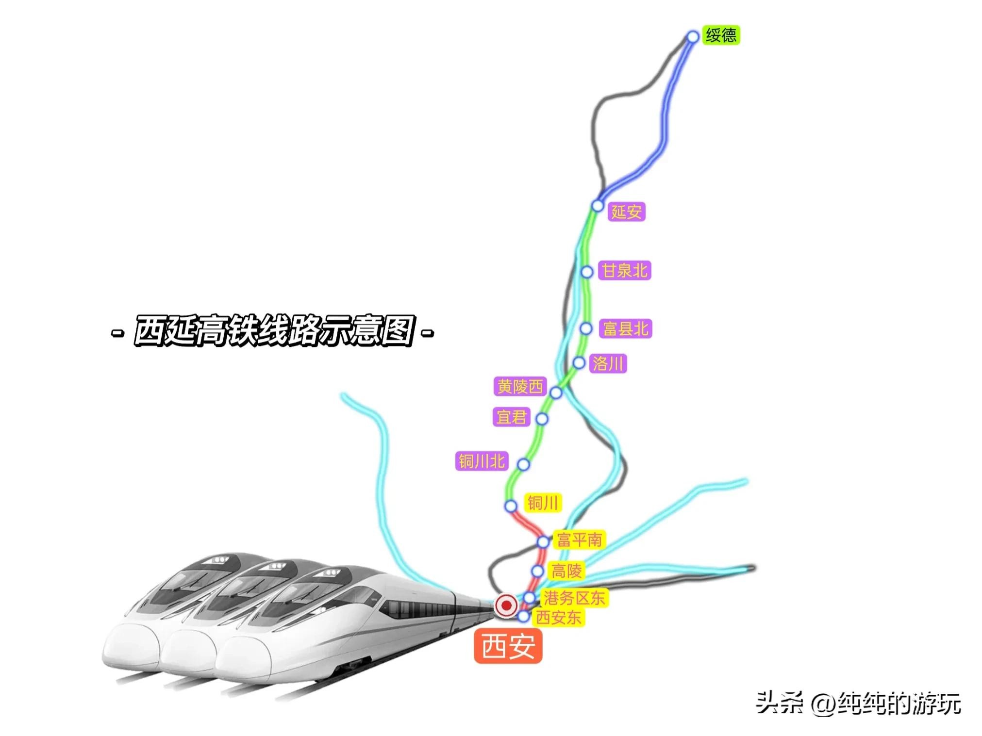 已经全线开工的铜川至延安段设立铜川北站、宜君站、黄陵西站、洛川站、富县北站、甘泉北站和延安站,两段线路组成西延高铁,全线总共站点11座,总投资约551.6亿元。