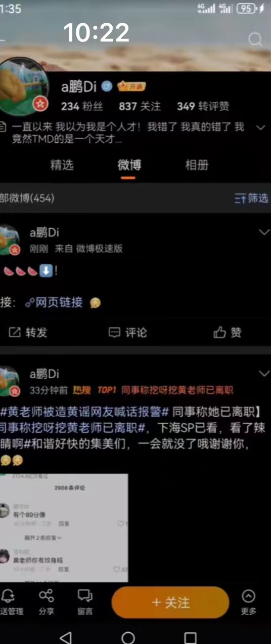 其中一位两天涨粉200万的黄老师,在2024年2月,互联网上流传与她相关的一则聊天记录,聊天记录中有人称自己花费3万元约到黄老师,并附带几张在酒店内的视频截图。该信息传播后,部分网友在黄老师账号下恶意留言。