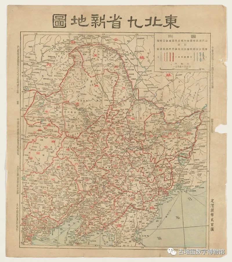 说明:《东北九省新地图》为民国34年(1945年)9月初版发行的当时东北地区9个省的详细地图,中国史地图表编撰社编制,亚光舆地学出版,大中国图书局发行。比例尺为1:480万,现藏馆不明确。