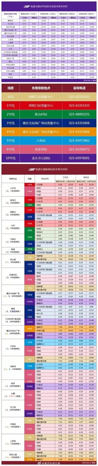 日前,重庆市轨道集团发布最新重庆轨道交通运营线路时刻表。每条已投运轨道交通线路首末班车时间、换乘站首末班车时间、轨道交通线网图、各线路失物咨询电话见下图