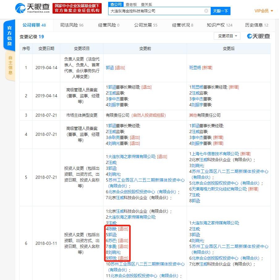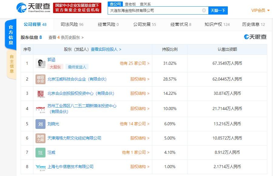 大连东海金控科技有限公司成立于2016年3月,注册资本约217万人民币,公司经营范围包括计算机软件技术开发、技术咨询、技术转让、技术服务,互联网信息服务,影视剧、专题片制作及发行等。该公司的最大股东为郭涵,持股比例31.02%,由胡海泉创办的海泉基金的投资实体之一北京合众创投股权投资中心(有限合伙)为第三大股东,持股比例14.22%。