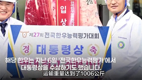 3. 这头韩牛不仅价格惊人,品质也极为优秀,被评为 1++A级,运输重量达 1006 公斤,且在 6 日举行的全国韩牛能力评价“比赛中荣获总统奖,该比赛是规模最大的韩牛评选活动,全面考察牛的大理石花纹及饲养条件。