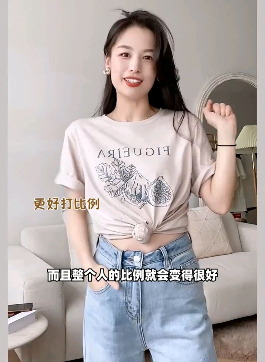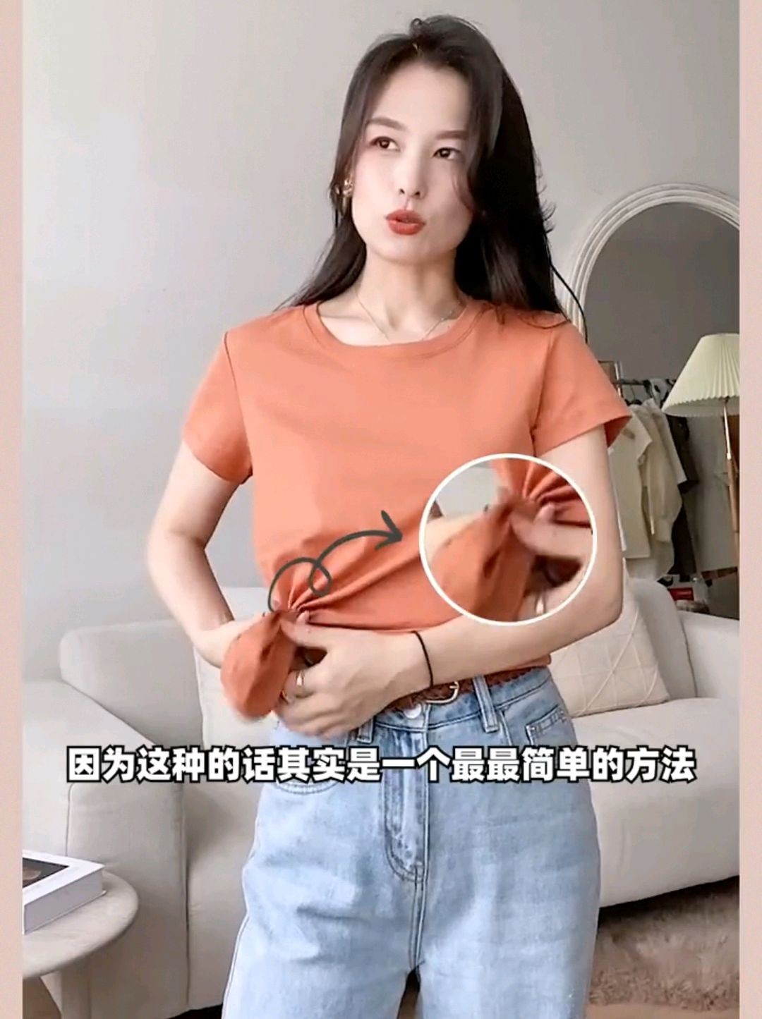 你可以把袖子挽起来,这样增加随意感,如果说有小肚子的女生或者是不喜欢露腰露肚子的女生就可以用这种打结方法,你看后面也非常平整,一点都不露。