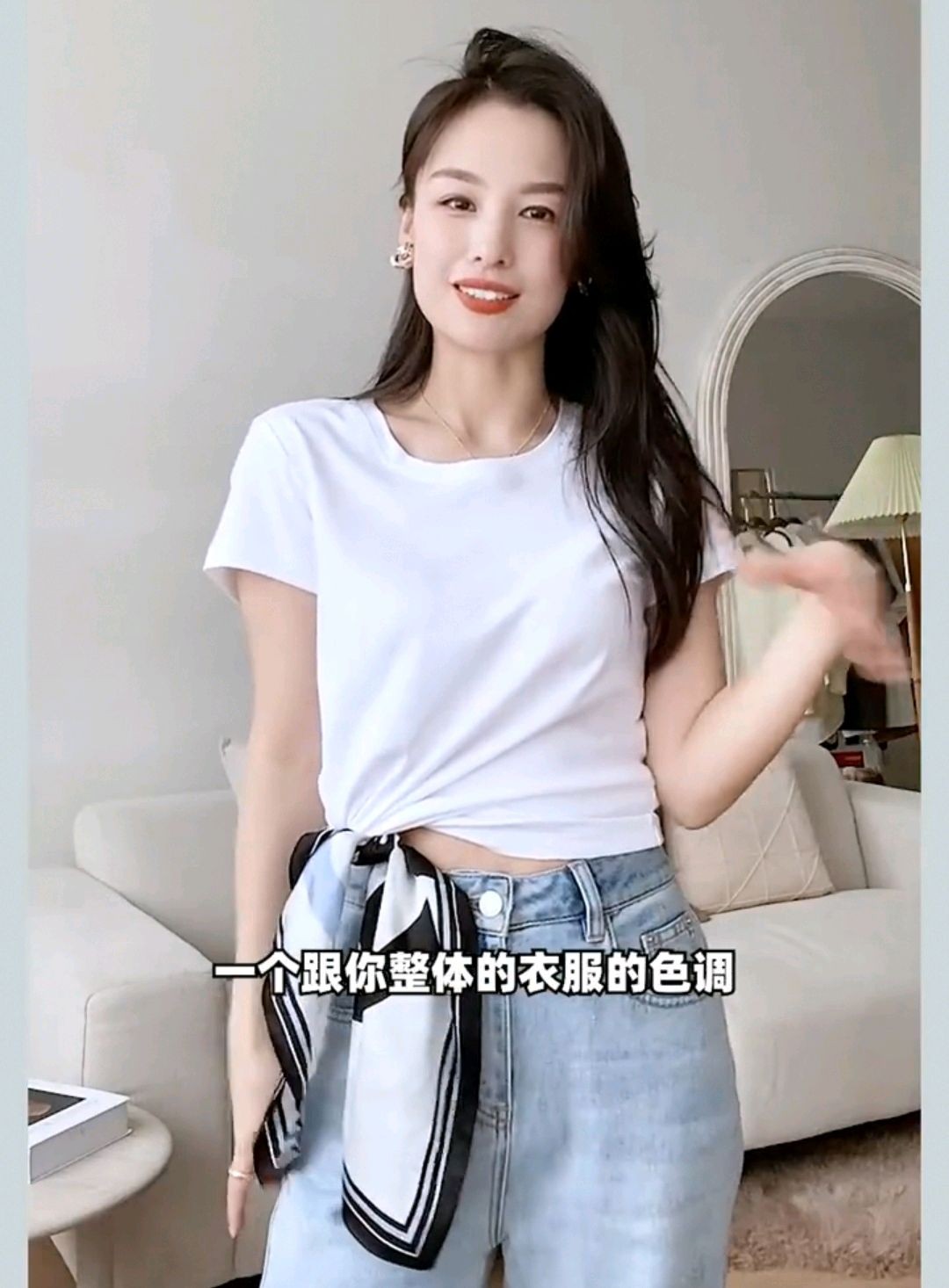 加入丝巾装饰,这样子一个白T完全不像一件普通衣服了是不是,所以说,我觉得这个方法也是一个很好的一个方法。我们的丝巾要去选择一个跟你整体的衣服的色调比较统一的颜色,比如说我选是这样的蓝白条的,我觉得作为一个点缀,白T加牛仔裤本身看起来比较简单嘛,这样子的话更有细节感。