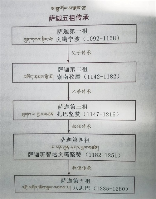 昆·衮却杰波创立以道果论为法要的教派,并于藏历第一饶迥水牛年公元1073年,正式修建萨迦寺。后经贡嘎宁波、索南孜摩、扎巴坚赞、贡噶坚赞、八思巴五代祖师的弘扬,兼有僧俗两系传承。至藏历第四饶迥年萨班、八思巴叔侄与元朝皇帝结法缘,西藏地方纳入元代中央政府行政统辖,萨迦法王因以统治全藏并摄理全国佛教事务。