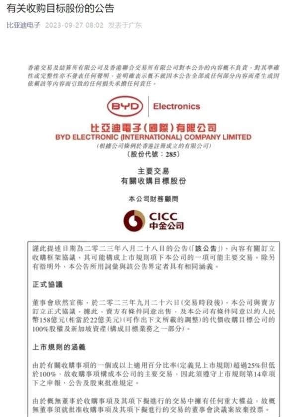 【CNMO新闻】比亚迪9月27日发布公告称,比亚迪股份有限公司控股子公司比亚迪电子(国际)有限公司于2023年9月26日与Jabil Inc.旗下子公司Jabil Circuit Pte. Ltd.签署了《股权收购协议》。此举正式标志比亚迪史上最大收购案成功完成。