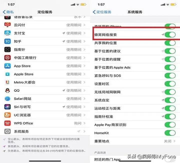 操作指南:【设置】—【隐私】—【定位服务】—【系统服务】—【蜂窝移动网络搜索】