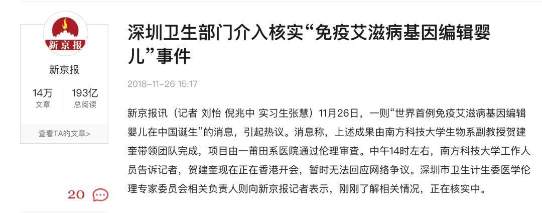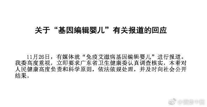 目前,深圳卫生部门介入核实“免疫艾滋病基因编辑婴儿”事件|。