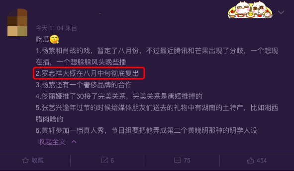 3日中午,还有八卦博主爆料称,罗志祥将在八月中旬的时候彻底复出。看他最近又是多平台取关周扬青,又是频繁更新动态的,看起来,可能也确实是离复出不远了。