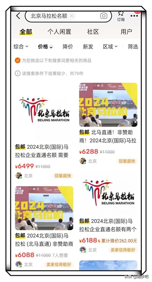 北京马拉松作为中国知名度最高、最近仪式感的马拉松,是中国历史最悠久的马拉松,被跑友们誉为国马,也是很多跑者心中最神圣的赛事之一,自然,北马的关注热度和报名人数也是最顶级的存在。不过令人没想到的是,在北马报名还没结束时,它的直通名额就已经炒到了天价!有人竟然在闲鱼最高叫价6499元,令人咋舌。