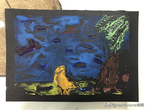 这张画最后的成品感还是很好的,但其实并不是那么好完成的,难点之一是造型,想要在吹塑纸上用铅笔把造型刻画好其实不是件简单的事情,要有耐心,也要有基本的造型能力;难点之二是思路要清晰,上色和拓印顺序不能改动,除非冲洗纸板,不然不能继续上色。