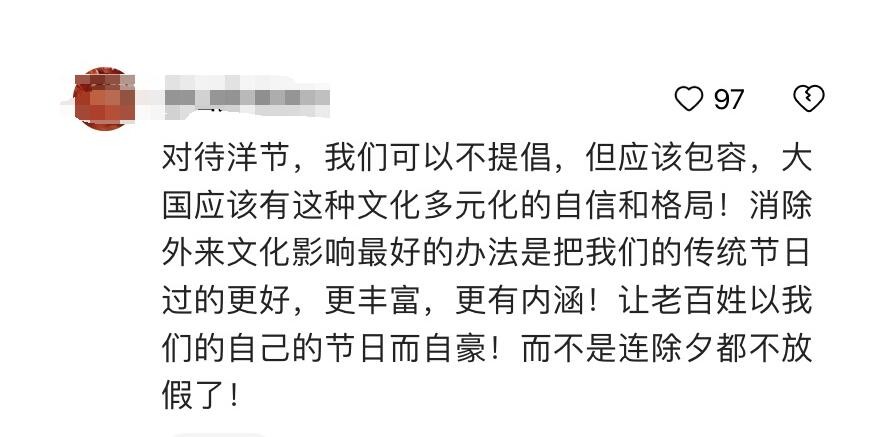 其次,也有网友认为,对于圣诞节不提倡,也不反对,但更多的是给予包容。就像我们的春节活动在部分国家流行的时候,主要以海外华人为主,并带动当地居民。难道这时候会说不要过我们的春节,这是我国的传统节日,其它国家的人没有资格过。我们国家并不会这样做,你想过就过。对于圣诞节也应该保持这样的看法,想过圣诞节的人就让他们过,不反对,但要做到包容。