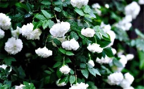 荼蘼花 枝梢茂密,花繁香浓,入秋后果色变红。宜作绿篱,也可孤植于草地边缘。