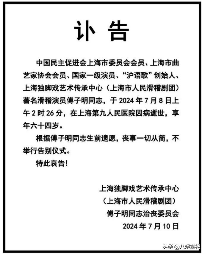 在艺术的殿堂里,有些灵魂如同流星,短暂而璀璨;傅子明,这位上海滑稽戏界的传奇人物,于2024年7月8日凌晨悄然离去,将笑声永远留在人间。他的突然离世,不仅让上海乃至全国的戏迷愕然,更让无数人为之唏嘘——生命之脆弱,竟如此不堪一击。