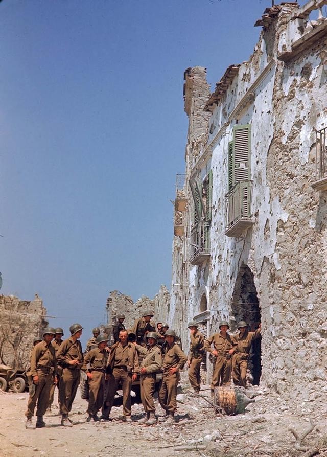 十七,二战期间,在前往罗马的途中,美军站在一座被炸毁的建筑物前。