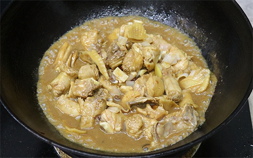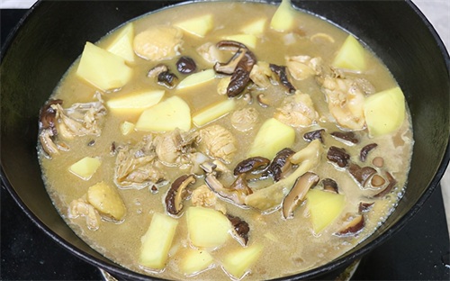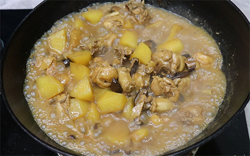 第八步:鸡肉和土豆都被焖熟后开盖,调味少许盐和白糖,并用勺子搅拌均匀,此时的汤汁已经很粘稠了。
