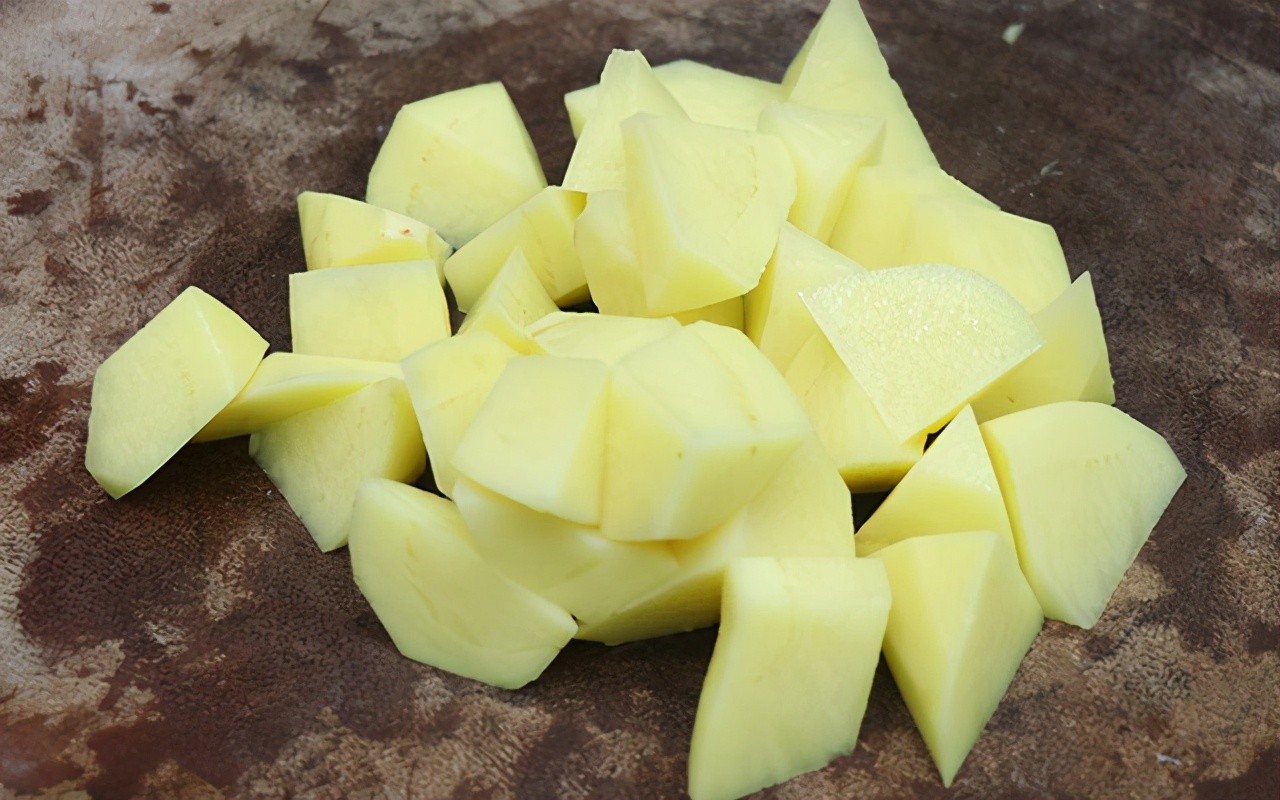 第一步:土豆清洗干净后去皮,再切成滚刀块,浸泡至清水中,洗去表面的土豆淀粉。
