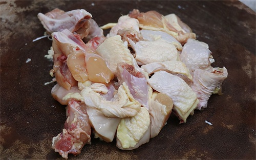 第四步:把鸡肉清洗干净并剁成大块,接着加入清水多清洗几遍,洗去里面的血水,洗好后捞起来挤干水分备用。