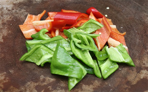 第九步:把准备好的青红椒块下入锅中,用勺子翻动,待青红椒块煮熟后再淋入少许香油,即可出锅装入大碗中,美味即成。