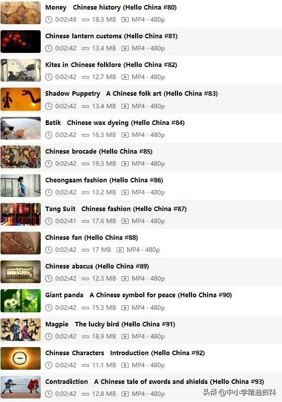 视频用动画的方式,非常中国风,讲解中国传统文化的100个常见名词,比如筷子、如意、红娘、长城、唐装、旗袍、24节气、孔子、西游记,风水、端午等...