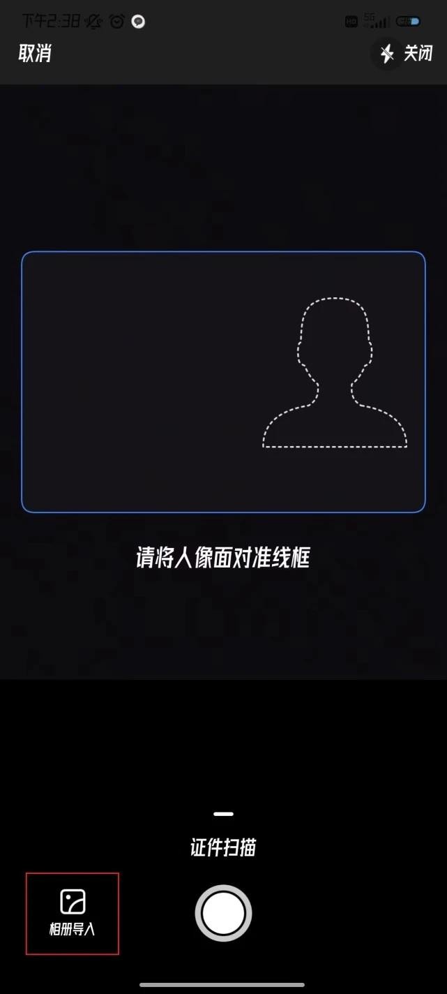 3、我们可以选择【相册导入】,或者直接拿出身份证进行扫描,沿着虚线进行对准扫描就可以了。如果防止盗用还可以【添加水印】。