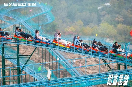 车主们在黄金寨游玩时可谓尽兴至极。乘坐观光车体验七彩滑草、龙啸电轨车、悬壁火车、管式滑道、玻璃吊桥等项目,充满了刺激与乐趣。