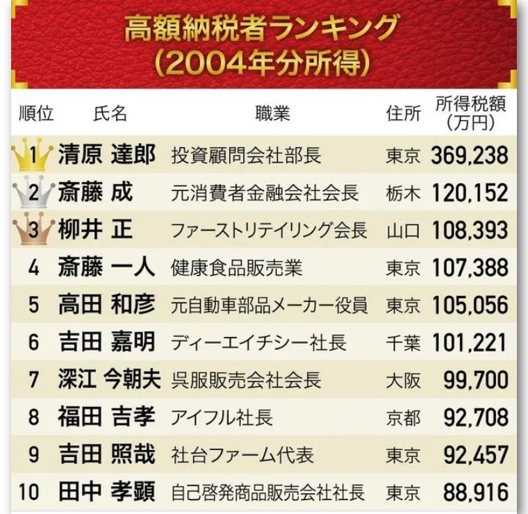 所以,最后一次根据纳税金额来推算收入的日本富豪榜,也停留在了2004年。