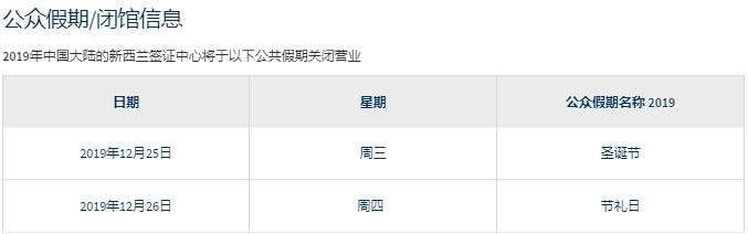 2019年12月25日(星期三)至12月26日(星期四)是西方圣诞节与节礼日,中国大陆的新西兰签证中心将于这两天公共假期中关闭营业。