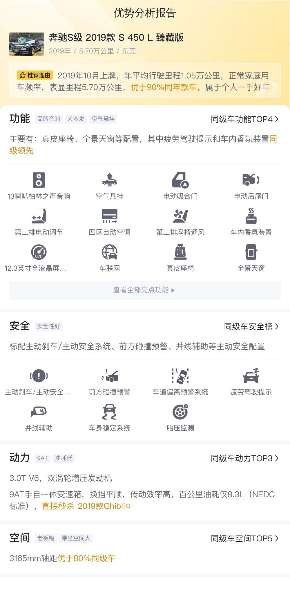 总结:这辆2019款奔驰S级S 450 L臻藏版是一款集豪华、舒适、科技和安全于一身的豪华轿车。它在品牌影响力、豪华配置、动力性能和舒适性等方面均表现出色,适合追求卓越驾乘体验和高品质生活的消费者。尽管如此,购车时仍需注意车身状况、维修记录、保养周期等情况,以确保购买到一辆车况良好的车辆。总体而言,如果能以一个合理的价格购买到这辆车,将是一次非常不错的选择。