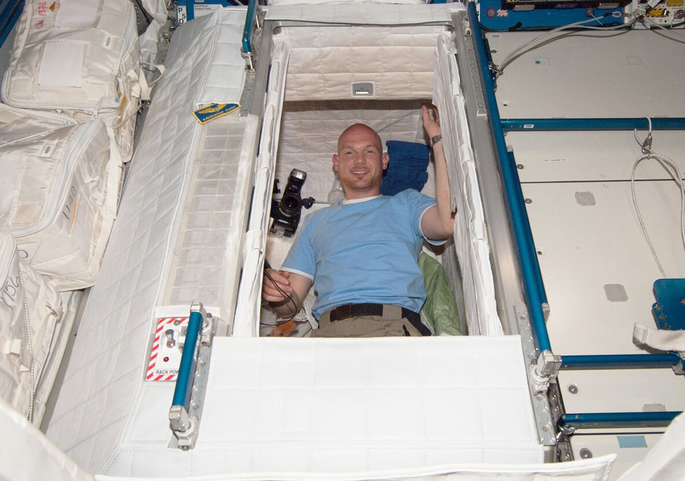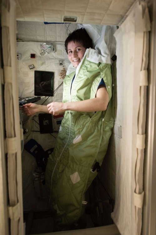 为了解决睡觉的问题,国际空间站上发明了一种“船员交替睡眠住宿”(CASA)安排,就是大家轮流使用睡眠舱,而没有专用床位的航天员,则各自去找噪音比较小的地方打地铺,钻进睡袋里将自己挂在舱壁上,像蝙蝠那样睡觉。但一般来说,大家对女性航天员还是比较照顾的,会给她比较私密的空间,准备返回地球的航天员也会主动去睡“挂铺”。