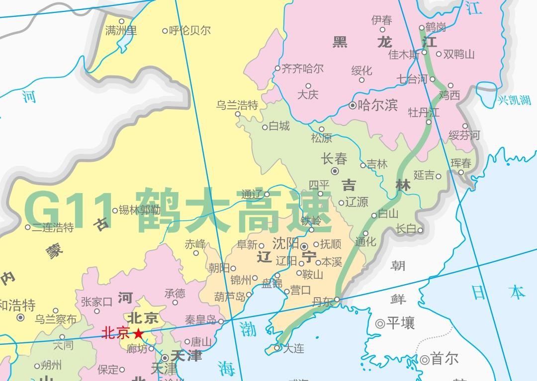 鹤大高速(G11):从黑龙江省鹤岗市通往辽宁省大连市,中途经过鹤岗-佳木斯-七台河-牡丹江-白山-通化-丹东-大连等市,是纵穿东北的重要交通线,途经黑龙江、吉林、辽宁等3省,全长1474公里,开车从鹤岗到大连需要15小时。