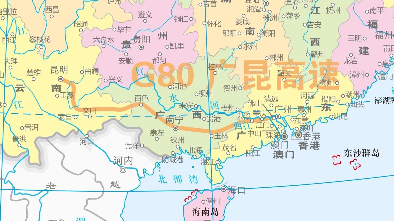 广昆高速(G80):从广东省广州市通往云南省昆明市,中途经过广州-肇庆-云浮-玉林-南宁-百色-砚山-石林-昆明等市,途经广东、广西、云南3省,全长1386公里,开车从广州到昆明需13个小时。