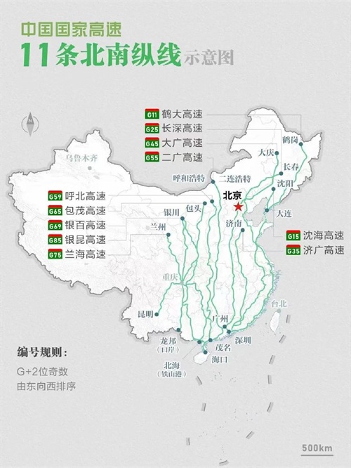 二、国内北南方向共有11条高速公路纵线,贯穿中国南北部