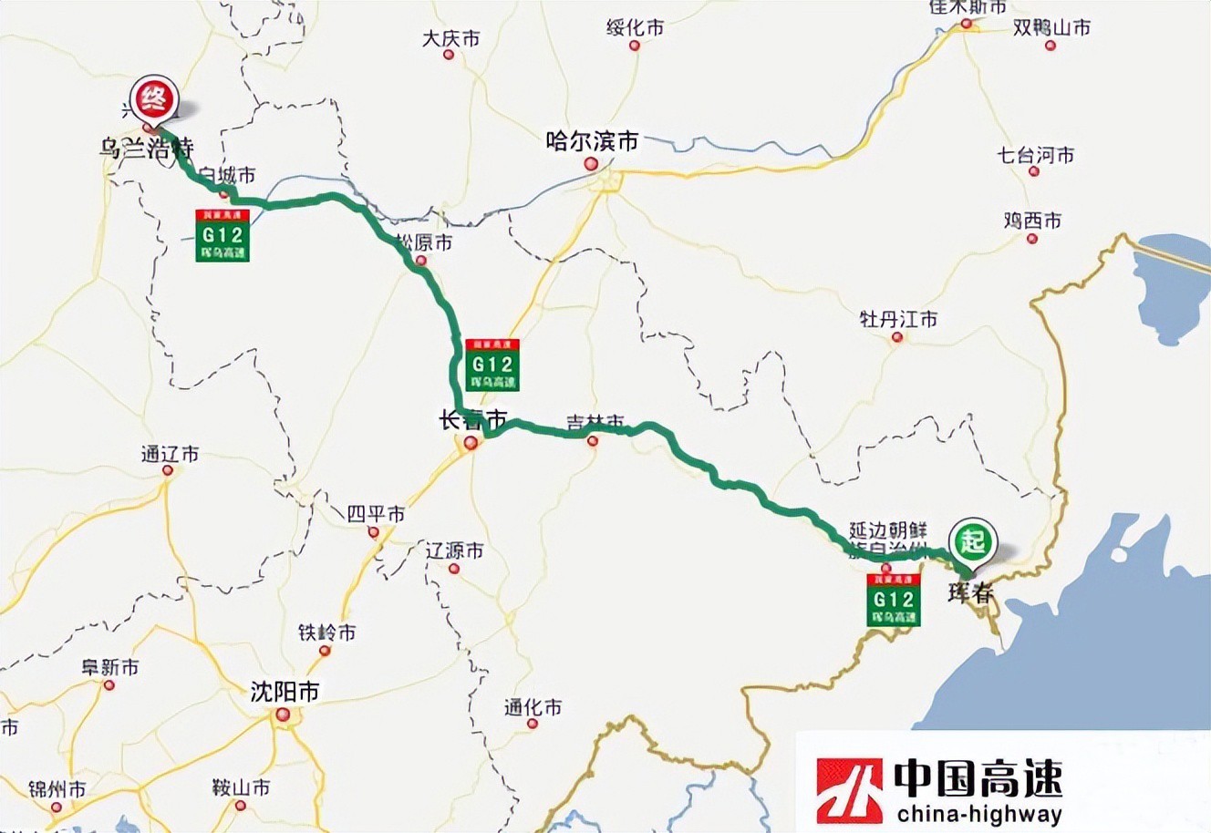 珲乌高速(G12):从吉林省珲春市通往内蒙古乌兰浩特市,中途经过珲春-延吉-吉林-长春-松原-大安-白城-乌兰浩特等市,途经吉林、内蒙古2省,全长885公里,开车从珲春到乌兰浩特需8个小时。