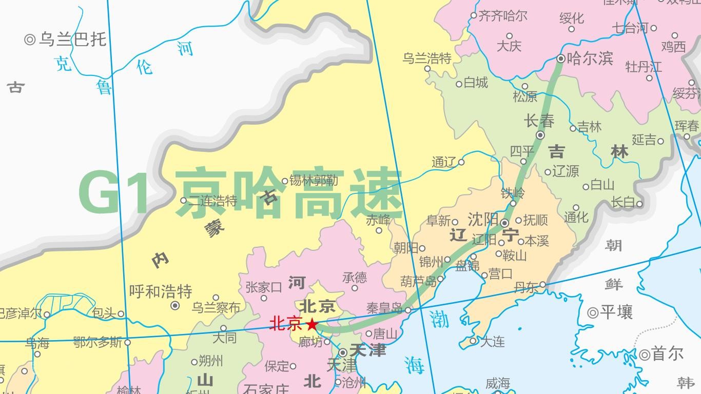 京哈高速(G1):从北京市通往黑龙江省哈尔滨市,中途经过哈尔滨-长春-沈阳-锦州-秦皇岛-北京等市,是北京通往东北的交通大动脉,途经北京、天津、河北、辽宁、吉林、黑龙江等6省市,全长1206.699公里,开车通过京哈高速从哈尔滨到北京需11个小时。