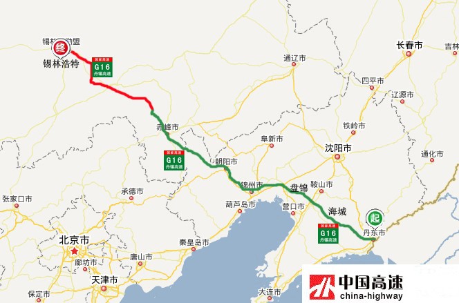 丹锡高速(G16):从辽宁省丹东市通往内蒙古锡林浩特市,中途经过丹东-海城-盘锦-锦州-朝阳-赤峰-锡林浩特等市,途径辽宁、内蒙古2省区,全长960公里,开车从丹东到锡林浩特需9小时。