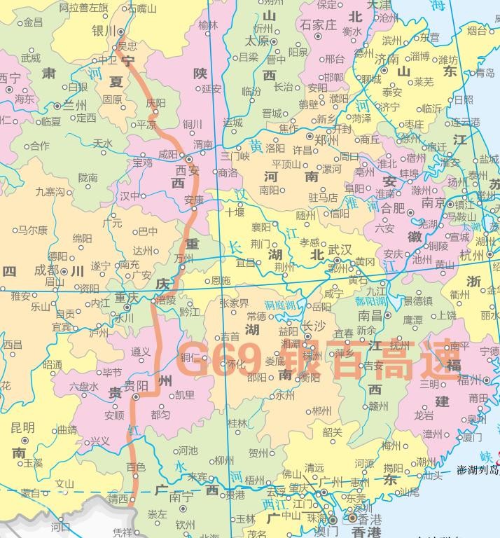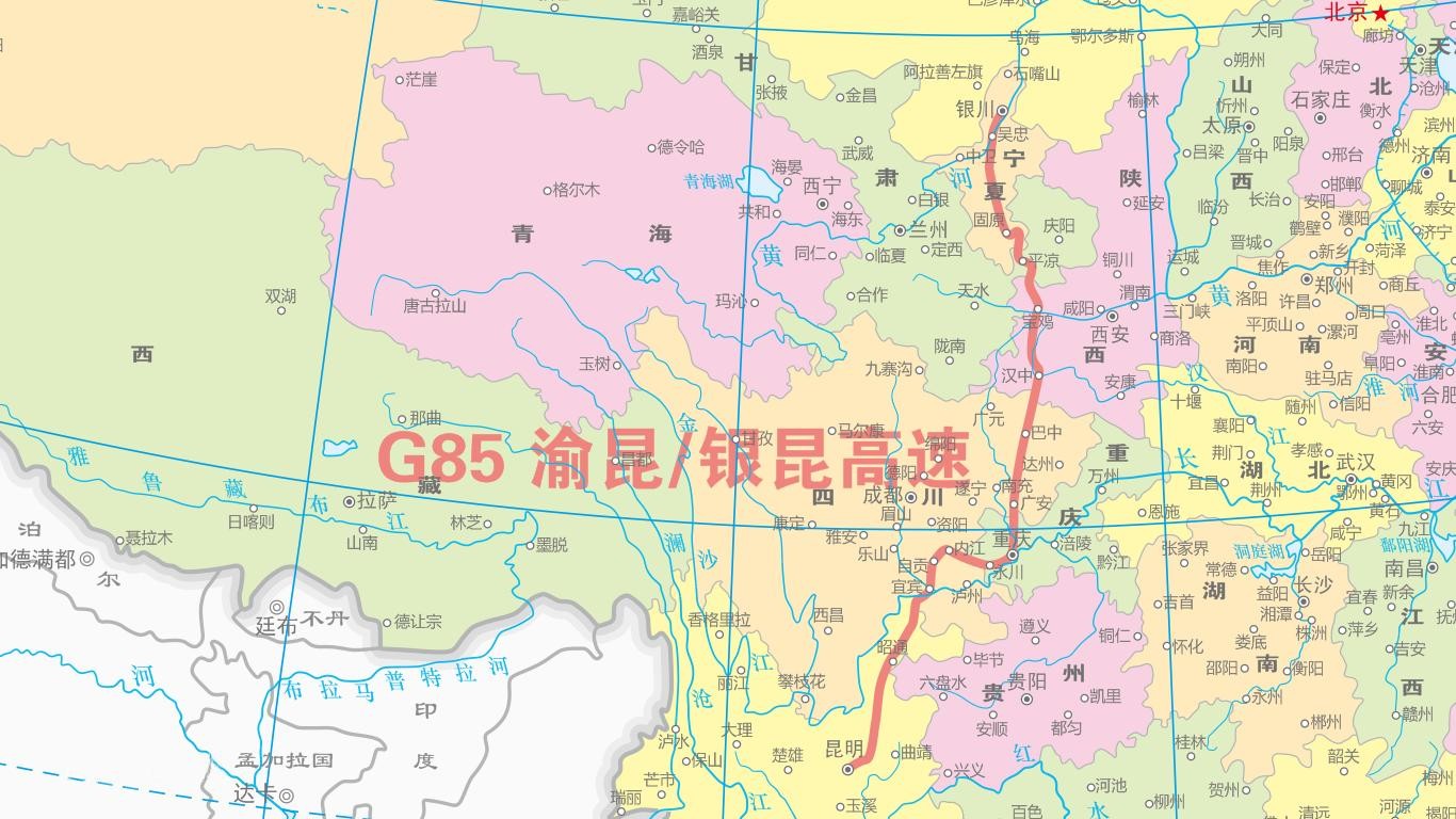 银昆高速(G69):从宁夏银川市通往云南省昆明市,中途经过银川-平凉-汉中-巴中-重庆-内江-宜宾-昆明等市,是从宁夏经过陕西、四川到达云南的一条重要交通线,途径甘肃、陕西、四川、重庆、云南5省市,全长2322公里,开车从银川到昆明需24个小时。