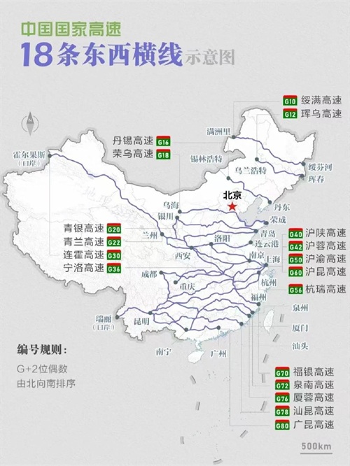 三、国内东西方向共有18条高速公路横线,贯穿中国东中西部