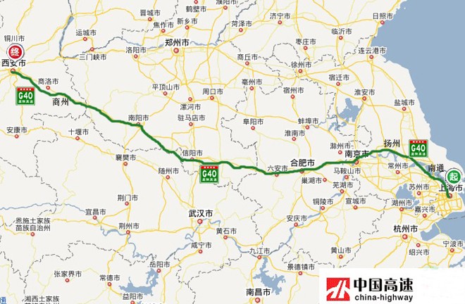 沪陕高速(G40):从上海市通往陕西省西安市,中途经过上海-南通-泰州-扬州-南京-合肥-信阳-南阳-商洛-西安等市,途经上海、江苏、安徽、河南、陕西等5省市,全长1524.196公里,开车从上海到西安需15个小时。