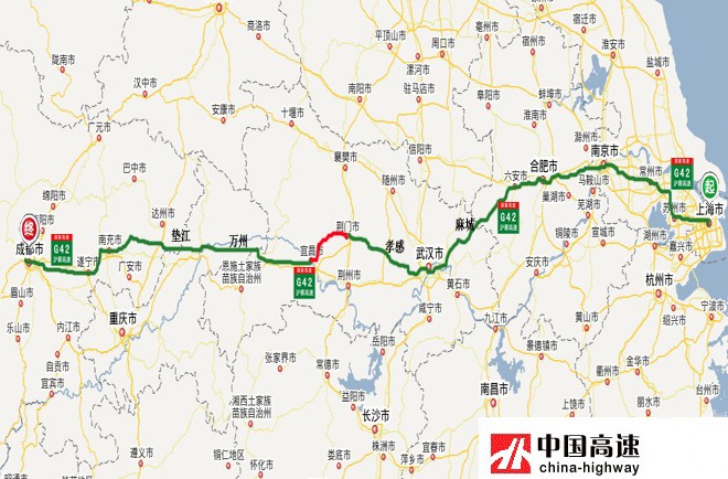 沪蓉高速(G42):从上海市通往四川省成都市,中途经过上海-苏州-马鞍山-合肥-武汉-宜昌-恩施-广安-遂宁-成都等市,途经上海、江苏、安徽、湖北、重庆、四川等6省市,全长1982.366公里,开车从上海到成都需20个小时。