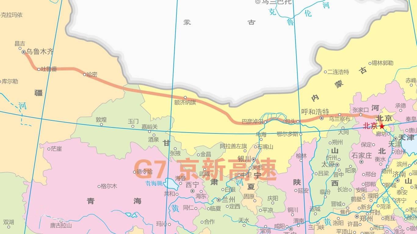 京新高速(G7):从北京市通往新疆乌鲁木齐市,中途经过北京-张家口-呼和浩特-包头-额济纳旗-哈密-吐鲁番-乌鲁木齐等市,是北京通往新疆的交通大动脉,途经北京、河北、山西、内蒙古、甘肃、新疆等6个省区市,全长2540公里,开车从乌鲁木齐到北京需30个小时。