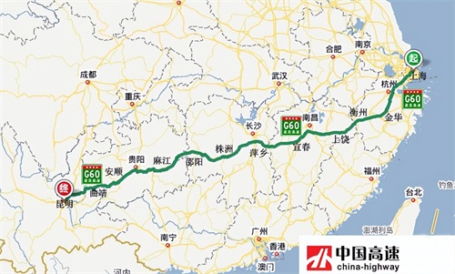 沪昆高速(G60):从上海市通往云南省昆明市,中途经过上海-杭州-金华-衢州-上饶-南昌-宜春-萍乡-邵阳-麻江-贵阳-安顺-曲靖-昆明,途经上海、浙江、江西、湖南、贵州、云南6省市,全长2252公里,开车从上海到昆明需22个小时。