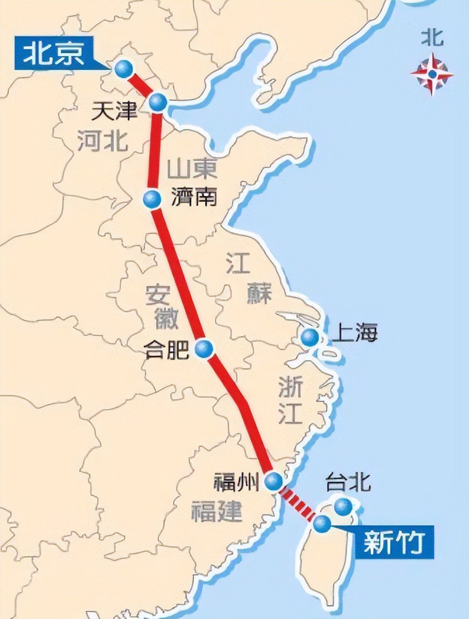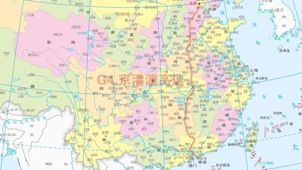 京台高速(G3):从北京市通往台湾省台北市,中途经过北京-天津-济南-合肥-福州-新竹-台州等市,是北京通往东南的交通大动脉,途经北京、天津、河北、山东、安徽、浙江、福建、台湾等8省市,全长1990.929公里(以福建平潭为终点),开车从台北到北京预估需21个小时。