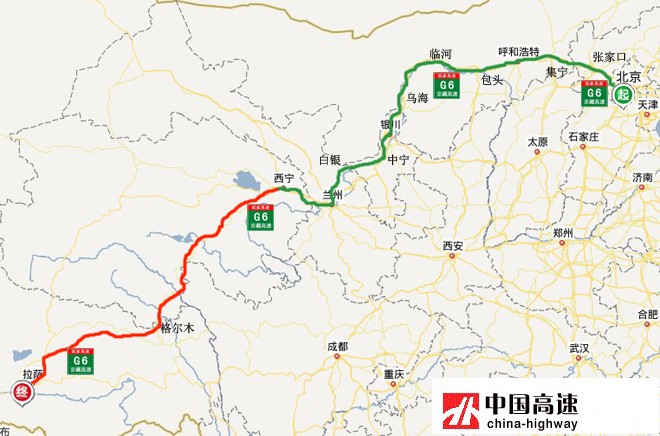 京藏高速(G6):从北京市通往西藏拉萨市,中途经过北京-张家口-呼和浩特包头-银川-兰州-西宁-格尔木-拉萨等市,是北京通往西藏的交通大动脉,途经北京、河北、内蒙古、宁夏、甘肃、青海、西藏7省区市,全长3734.556公里,开车从拉萨到北京只需46个小时。
