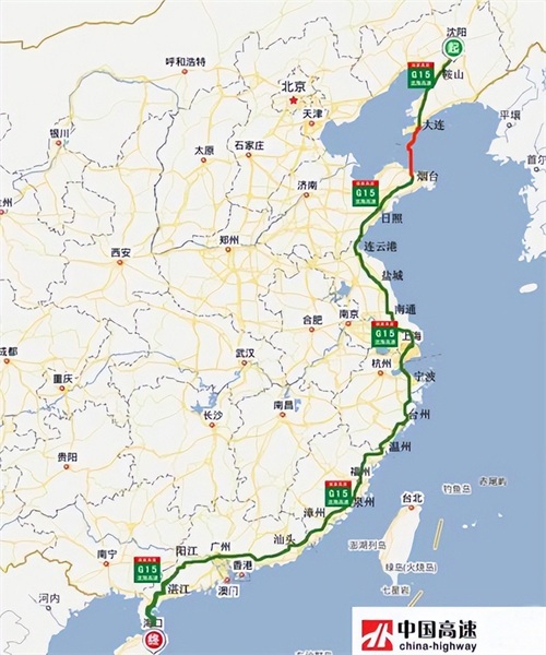 沈海高速(G15):从辽宁省沈阳市通往海南省海口市,中途经过沈阳-鞍山-大连-烟台-日照-连云港-南通-上海-宁波-台州-温州-泉州-汕头-广州-湛江-海口等市,是贯穿东部沿海城市的一条重要交通线,途径辽宁、山东、江苏、上海、浙江、福建、广东、海南等8省市,全长3710公里,开车从沈阳到海口需要40个小时。